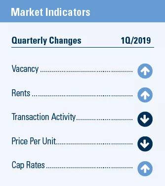 - Sales activity to start 2019 was slower than in recent periods and was concentrated in apartment complexes with fewer than 100 units. The median price dipped a modest 3 percent during the first quarter, while cap rates ticked up 20 basis points to the low 5 percent range.
