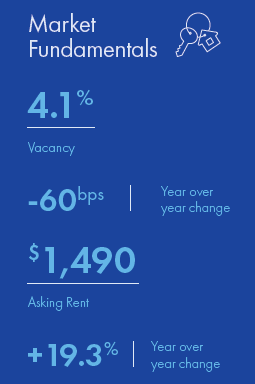 - Vacancy ticked higher at the end of 2021, after reaching its lowest point of the past decade in the third quarter. Despite the recent rise, the local vacancy rate still ended the year at 4.1 percent, 60 basis points lower than at the end of 2020.