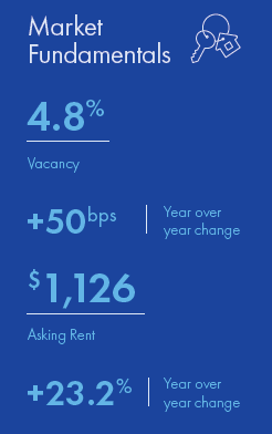 - Apartment vacancy rose 40 basis points in the first quarter to 4.8 percent. This marked the second consecutive quarter where the rate ticked higher, following several years of gradual declines. During the past 12 months, the rate has risen 50 basis points.
