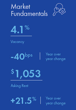 - The Tucson multifamily market posted continued improvement during the third quarter. The vacancy rate fell even as developers continued to bring new units to the market. Fueled by tightening vacancy rates and continued renter demand, rents remained on a steep upward trajectory.